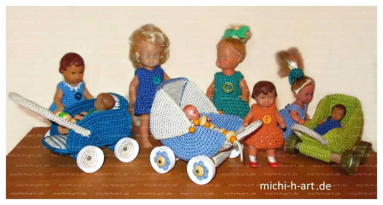 Diese drei Puppen haben einen Bollerwagen, Mini-Puppen und Spielzeugkatzen bekommen.